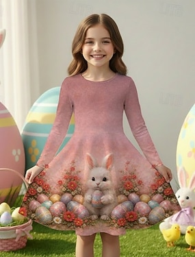 Pääsiäinen Tyttöjen 3D Kuvitettu Kani Mekko Pitkähihainen 3D-tulostus Kevät Syksy Päivittäin Loma Juhla Vapaa-aika Prinsessa Kaunis Lapset 4-12 vuotta Rento mekko A linjainen mekko Polvipituinen