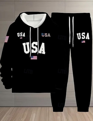 Amerikan itsenäisyyspäivä Miesten Amerikan lippu 2kpl 3D-hupparisarjat Verryttelypuku Huppari Pitkähihainen Pitkät housut Hupullinen Urheilullinen Rento arki Urheilu- ja treenivaatteet 3D-tulostus