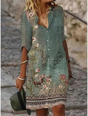 naisten paita mekko rento mekko vaihtomekko midi mekko ulkona päivittäin loma muoti moderni paita kaulus nappi painatus puolihihainen kesä kevät tavallinen istuvuus kukka