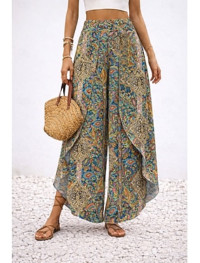 Naisten Leveä reisi Housut Loma Vapaa-aika Boheemi Täyspitkä Keskikorkea vyötärö Kuvitettu Paisley-kuvio Monitaso Epäsymmetrinen Pehmeä Mukava Joustamaton Päivittäin ulko- Loma Violetti Kevät Syksy