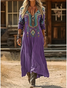 Naisten Maksimekko Boho-mekko Vintage mekko Rento mekko Vintage Päivittäin ulko- Loma Normaali Kukka Pitkähihainen V kaula-aukko Sininen Punastuvan vaaleanpunainen Purppura Kevät Syksy