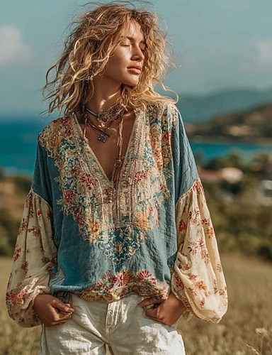 Naisten Paita Kuvitettu Geometrinen Paisley-kuvio Böömi Loma Vintage Pitkähihainen V kaula-aukko Tavalliset topit Päivittäin Pyhäpäivä Bile Sininen Valkoinen Vaalean ruskea Apila Kesä Kevät