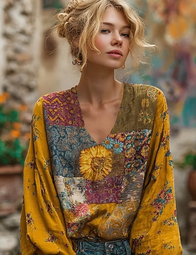 Naisten Pusero Painettu Kuvitettu Geometrinen Vintage Päivittäin Tyylikäs Pitkähihainen V kaula-aukko Tavalliset topit Kausaliteetti Päivittäin Pyhäpäivä Sininen Purppura Oranssi Apila Kesä Kevät