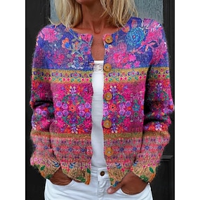 Naisten neulejakku neulottu ribattu nappi edessä pyöreä kaula-aukko pitkähi wristkevyt tyylikäs vintage päivittäinen kukkakuva geometrinen painatus neulottu ulkoilu päivittäin lomilla musta violetti