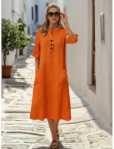 Naisten midi-kokoinen pellavajäljitelmämekko, pitkähihainen, kesämekko, rento, päivittäinen väljä istuvuus, yksivärinen, lyhythihainen, pyöreä pääntie, sininen, keltainen, vihreä, beige, kesä, kevät