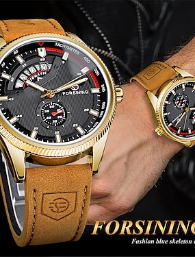 FORSINING miesten mekaaninen kello ulkoiluun urheilu muotikello automaattinen itsevetävä luminous kalenteri vedenkestävä nahkakello