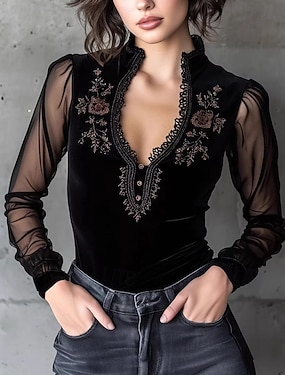 Naisten Pusero Pitsi Topit Pitsi Tavallinen Vintage Tyylikäs Perus Pitkähihainen V kaula-aukko Tavalliset topit Päivittäin Pyhäpäivä Bile Musta Kevät Syksy