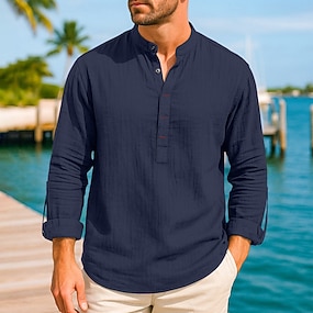 Miesten Paita Pellava paita Kesä paita Ranta-asut Band kauluspaita Button Up paita Yhtenäinen väri Kausaliteetti Loma Sininen Musta Valkoinen Laivaston sininen Lyhythihainen Pystykaulus Kesä Kevät