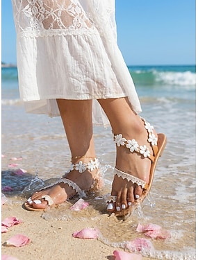naisten norsunluunvalkoiset pitsiset litteät sandaalit, tyylikkäät boheemit morsiuskengät rantahääihin