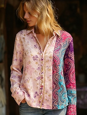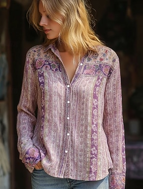 Naisten Paita Boho paita Keinopuuvillainen pellava Napit Painettu Kukka Böömi Aktiivinen Vapaa-aika Pitkähihainen Paitapuserokaula-aukko Tavalliset topit Päivittäin Pyhäpäivä Purppura Kevät Syksy