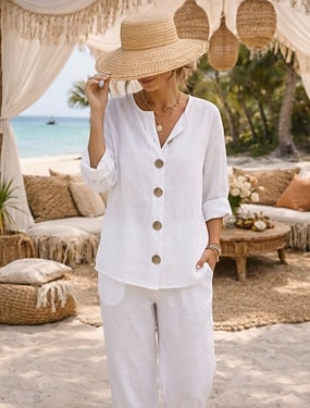 Naisten Paita Puuvillaiset pellavapaidat Painike ylös Pusero Napit Yhtenäinen väri Perus Vapaa-aika 3/4 hiha V kaula-aukko Tavalliset topit Päivittäin Musta Valkoinen Rubiini Khaki Kesä