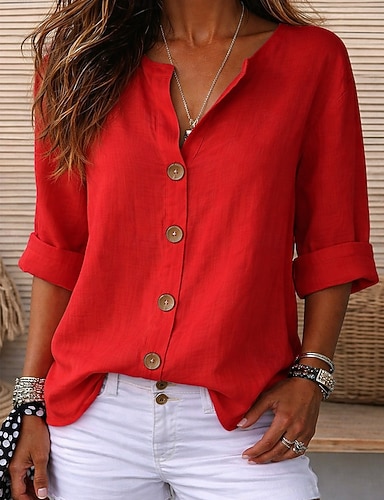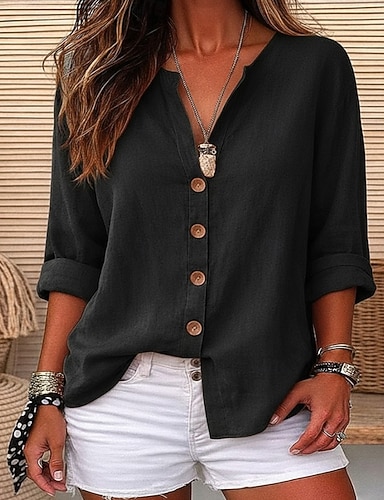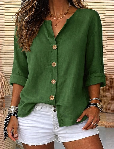Naisten Pusero Keinopuuvillainen pellava Napit Yhtenäinen väri Perus Vapaa-aika Lyhythihainen Paitapuserokaula-aukko Tavalliset topit Päivittäin Sininen Valkoinen Aprikoosi Kesä Kevät