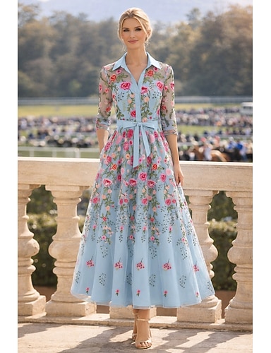 A-linja Mekot Nilkkapituinen Polven yli Häävieraspuku Morsiammen äidin asu 3/4 hiha Paitapuserokaula-aukko Tyylikäs Vintage Muodollinen Häävieras Kentucky Derby Satiini Tylli kanssa Kukkapainatus