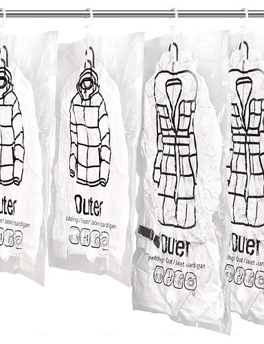4 kpl ripustettavaa pölynimuripussia, uudelleenkäytettävää tilaa säästävää puristettua pussia ripustimilla. 2 kpl kokoa 26,3 x 35,4 tuumaa (67 x 90 cm) ja 2 kpl kokoa 26,3 x 43,3 tuumaa (67 x 110 cm).