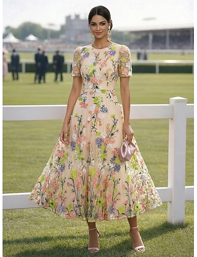 A-linja Polven yli Cocktailmekot Tyylikäs Vintage Kukka-aihe Lyhythihainen Tiukka pyöreä kaula-aukko Puutarhajuhlat Häät Satiini Tylli Laskostettu selkä kanssa Kirjailtu kukka Laskokset Kirjonta