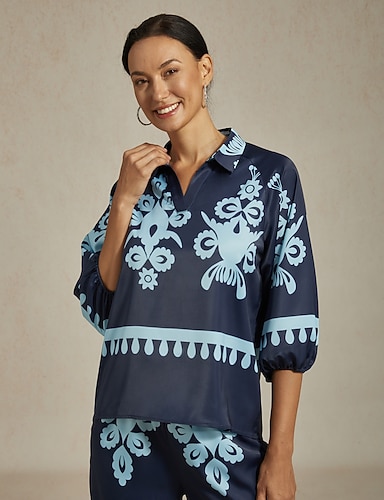 naisten satiininen v-aukkoinen väljä istuvuus dolman-hihainen geometrisella kuviolla varustettu pusero