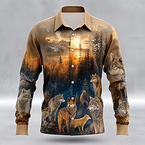 Miesten Eläin Susi Luonto ja maisemat Paita Button Up paita Pitkähihainen Vintage retro Kausaliteetti ulko- Metsästys Kevät Syksy Sänkyjen avaus 3D-tulostus kauluspaidat Sininen Harmaa