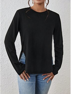 Naisten T-paita Side split Yhtenäinen väri Tyylikäs Klassinen Vapaa-aika Pitkähihainen Tiukka pyöreä kaula-aukko Tavalliset topit Päivittäin Bile Musta Kevät Syksy Talvi