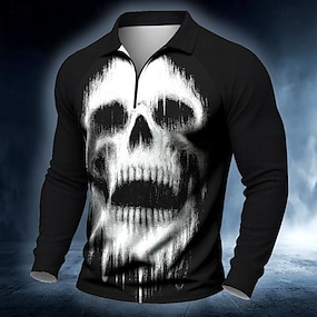 Kuolleiden päivä Miesten Pääkallot Polo Pitkähihainen Poolopaidat Vapaa-aika Tumma ulko- Katu Arki-asut 3D-tulostus Quarter Zip Polo Kevät Syksy Talvi Rubiini Oranssi Apila