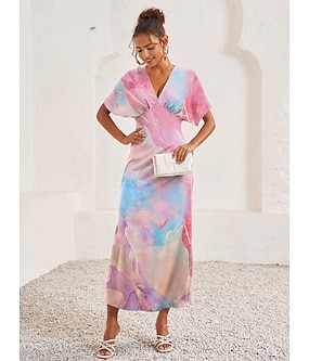 naisten maksimekko kukkaprintti v-kaula flutter hiha virtaava sininen valkoinen tyylikäs häävieras puutarhajuhlat kesä kevät naisellinen siluetti kevyt mukava eri kokoja