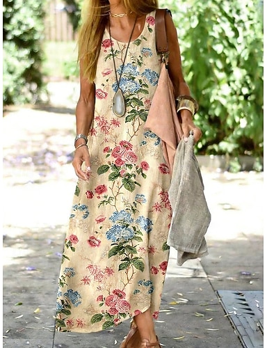 Naisten Maksimekko A linjainen mekko Olkapäältä pois menevä mekko Loma Vapaa-aika Boheemi Bile Loose Fit Kukka Kuvitettu Hihaton Tiukka pyöreä kaula-aukko Sininen Keltainen Ruusun vaaleanpunainen