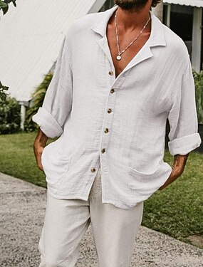 Miesten Paita Pellava paita Guayabera paita Kesä paita Rantapaita Yhtenäinen väri Loma Kausaliteetti Valkoinen Pitkähihainen Leirin kaulus Vaatetus Useita taskuja
