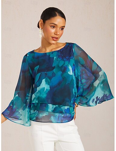 Naisten pusero, läpikuultava sifonki, vihreä, kukkakuvio, puolihiha, pyöreä kaula-aukko, kerrostettu helma, rento, tyylikäs, kevät, kesä, syksy