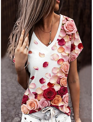 Ystävänpäivä Naisten T-paita Painettu Kukka Kuvitettu Tyylikäs Klassinen Vapaa-aika Lyhythihainen V kaula-aukko Tavalliset topit Päivittäin Bile Viikonloppu Punastuvan vaaleanpunainen Ruusun