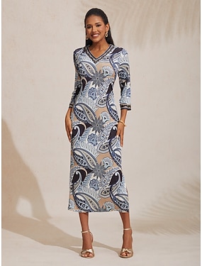 Naisten Midi-Mekko Pellavamaista Hengittävää Kevytrakenteista Aurinkomekkoa A-linjainen Mekko Loma Rentoa Boho Ranta Lörppömallia Graafista Geometriaa 3/4 Pituista Hihata V-kaula-aukolla Sininen