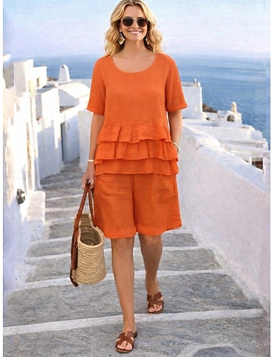 Naisten Puuvillaset liinavaatteet Shortsit setit Lyhythihainen Pyöreä kaula-aukko Yhtenäinen väri Röyhelö Tyylikäs Muoti Katutyyli Kausaliteetti Päivittäin ulko- Oranssi Kesä Normaali