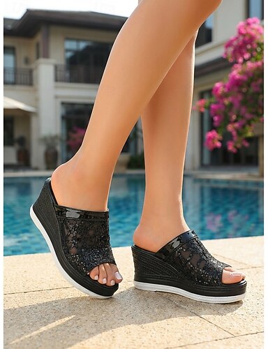 Naisten tyylikkäät mustat paljettiverkkokiilat - mukavat ontot korokesandaalit luksushotellin uima-altaan reunalle, iltalomalle &trooppiset lomat