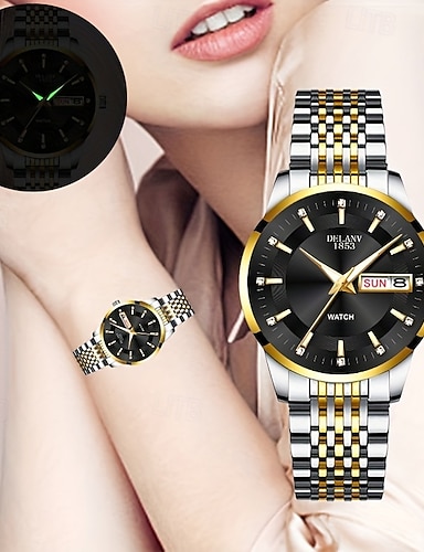 naisten luksuskello, kaksivärinen kulta-hopea ruostumattomasta teräksestä valmistettu ranneke, hohtavat viisarit päivämääräkalenterilla, elegantti musta kellotaulu timanttikoristeet rannekello