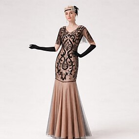 Möly 20s 1920-luku Kokopitkä Mekot Iltapuku Asut Lyhyet hihat Suuri Gatsby Häävieras Paljetti V kaula-aukko Naamiaispuku Naisten Iltajuhlat Juhla-iltavaatteet Naamiaiset Aikuisten Leninki Käsineet