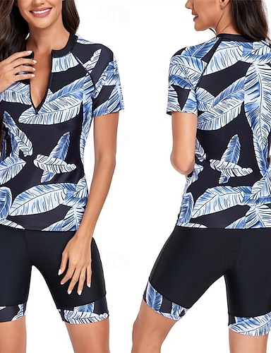Naisten Kaksiosainen uimapuku UV-aurinkosuojaus Nopea kuivuminen Kevyt Lyhythihainen Uima-asut Uimapuku 2-osainen Etuvetoketju Lainelautailu Hiekkaranta Vesiurheilu Urheilu Uinti Trooppinen Painettu