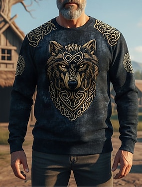 Miesten College Sininen Musta Ruskea Tiukka pyöreä kaula-aukko Susi Kelttiläinen solmu Painettu Kausaliteetti Päivittäin Katuvaatteet Vintage Viikinki Syksy Talvi Vaatetus Hupparit paidat