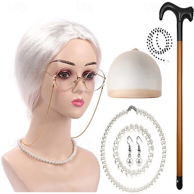 Vanhan naisen peruukki helmikaulakorukorvakorusetti naisille ja tytöille, isoäidille, cosplay, 100 päivää koulua -asu, halloween-juhlatarvikkeet