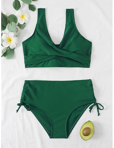 Naisten bikini 2 osanen uimapuku rypytetty värilohko lyhythameet vatsan kontrolli korkea vyötärö hoikka avonainen loma ranta-asuste yksivärinen V-kaulaauhjeluuden hihaton uimapuku