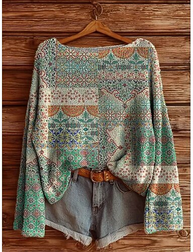 Naisten neulepusero rento pehmeä kukkakuvioinen vintage etninen pitkähihainen pyöreä kaula-aukko normaali topit päivittäin loma painatus pinkki punainen vihreä kevät syksy talvi