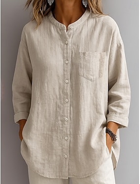 Womens 100% Puuvilla Pusero Väärennös Pellavaa Rypytetyt Napit Yksivärinen Tyylikäs Perus Rento Pitkä Hiha Kauluspaita Säännölliset Paitat Päivittäinen Sininen Musta Valkoinen Vaaleanpunainen Beige