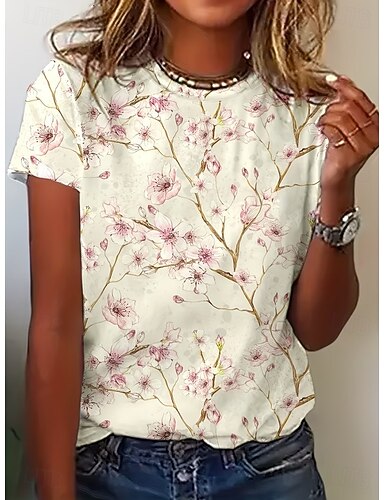 Naisten T-paita Painettu Kukka Kuvitettu Kasvit Tyylikäs Klassinen Vapaa-aika Lyhythihainen Tiukka pyöreä kaula-aukko Tavalliset topit Päivittäin Sininen Valkoinen Keltainen Punastuvan