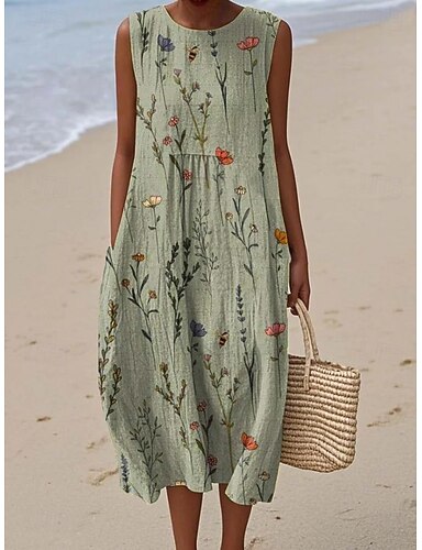 Naisten Midimekko Väljä mekko Kesämekko A linjainen mekko Loma Vapaa-aika Boheemi Hiekkaranta Juhla Bile Loose Fit Kukka Kuvitettu Hihaton Pyöreäkauluksinen Vaalean keltainen Syvä vihreä Harmaa