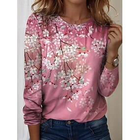 Naisten T-paita Painettu Kukka Kuvitettu Kasvit Vintage Tyylikäs Klassinen Pitkähihainen Tiukka pyöreä kaula-aukko Tavalliset topit Päivittäin Viikonloppu Sininen Punastuvan vaaleanpunainen Purppura