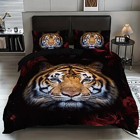 pussilakanasetti mustan ja punaisen ruusutiikerikuvioinen hotellityylinen vuodevaatesetti, jossa 1 pussilakanasetti ja 2 tyynyliinaa, pehmeää pehmokangasta, ei peittoa