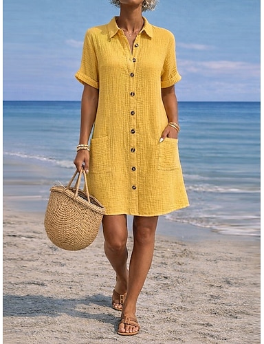 Naisten minimekko pellavajäljitelmämekko paitamekko lyhythihainen paitakaulus arkimekko muoti moderni päivittäin loma bile löysä istuvuus yksivärinen lyhythihainen paitakaulus keltainen
