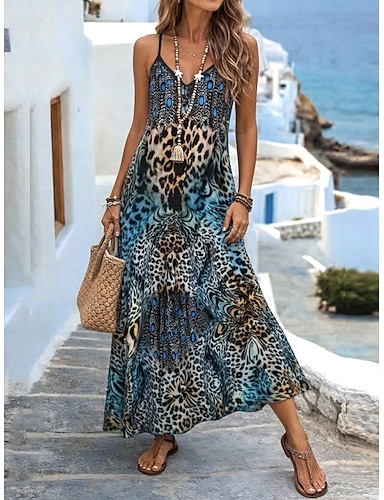 Naisten Maksimekko Kesämekko A linjainen mekko Slip Mekko Loma Vapaa-aika Hiekkaranta Bile Loose Fit Kuvitettu Eläin Leopardi Hihaton V kaula-aukko Sininen Kesä Kevät