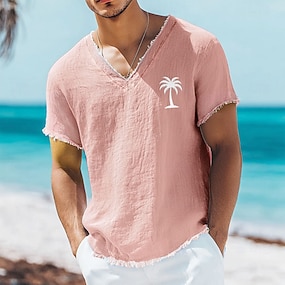 miesten palmukuvioinen pellava-puuvillasekoitteinen v-aukkoinen t-paita, raakareunainen, pölyisen roosanvärinen, kesäinen rantaloman t-paita, rispaantunut pehmeä muotisuunnittelijan paita, koko S-3XL