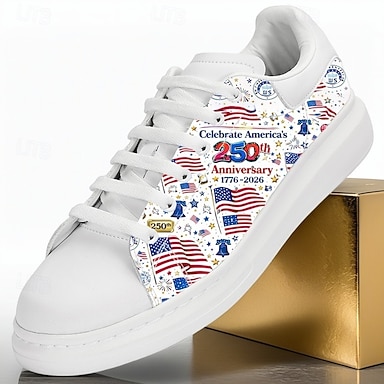 Miesten isänmaalliset vapaa-ajan lenkkarit – valkoiset puna-sini-tähden ja raidan kuvioinnilla, sopivat erinomaisesti 250-vuotisjuhliin, mukavat koko päivän käyttöön