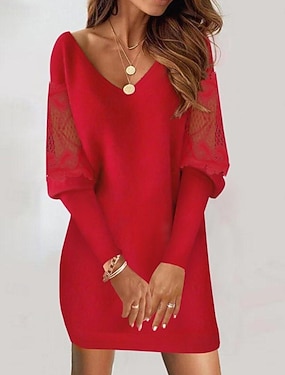 Naisten Mini mekko Valkoinen mekko Väljä mekko Tyylikäs Loma Vapaa-aika Pyhäpäivä Normaali Yhtenäinen väri Pitkähihainen V kaula-aukko Musta Valkoinen Rubiini Kevät Syksy