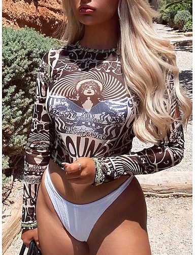 Naisten bikiniliivit 3-osainen uimapuku korkea leikkaus Slim avointa selkää lomaranta-asu kukallinen graafinen pyöreä kaula-aukko hihattomat pitkähihaiset uimapuvut
