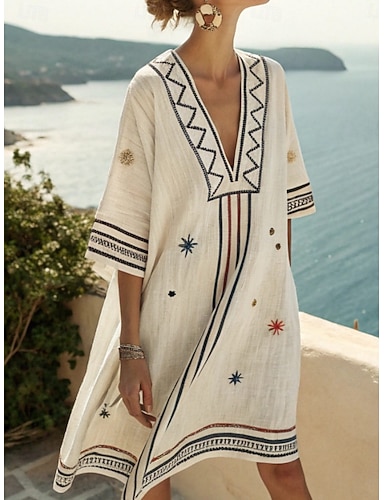 Naisten midi-mekko pellava-tyyppinen kesämekko shift-mekko A-linjan mekko loma rento boho ranta juhlat löysä istuvuus graafinen geometrinen olkaimettomana pyöreä kaula-aukko valkoinen kesä kevät